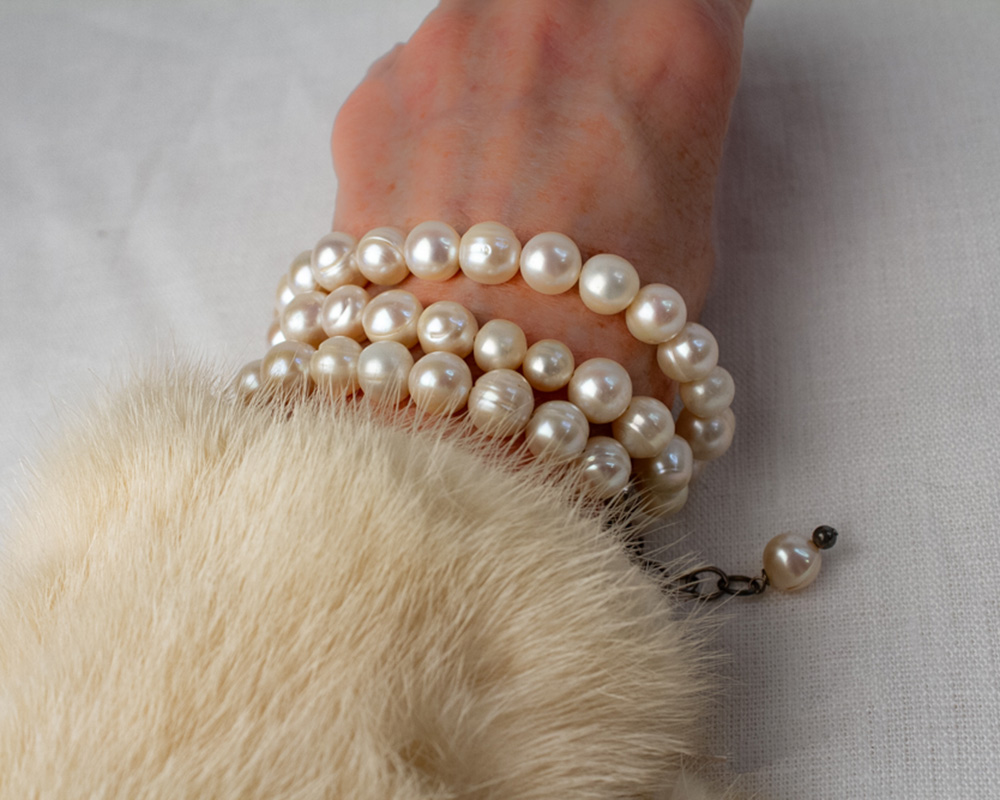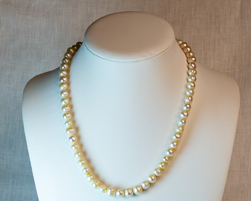 There is nothing like a simple strand of pearls. This 23″ necklace with 9mm fresh water pearls is finished with a sterling silver chain and clasp.