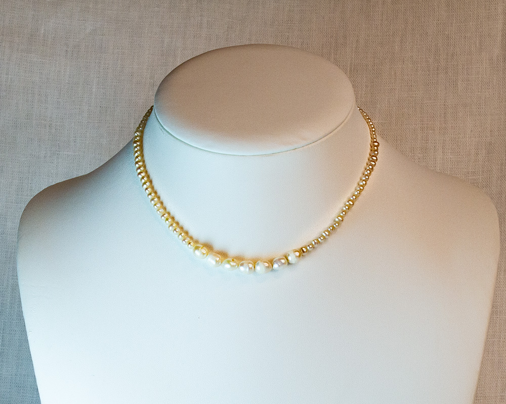 Beautiful luster, smaller fresh water pearls coupled with a few larger pearls for interest. 16″ finished with a 14k gold filled clasp.