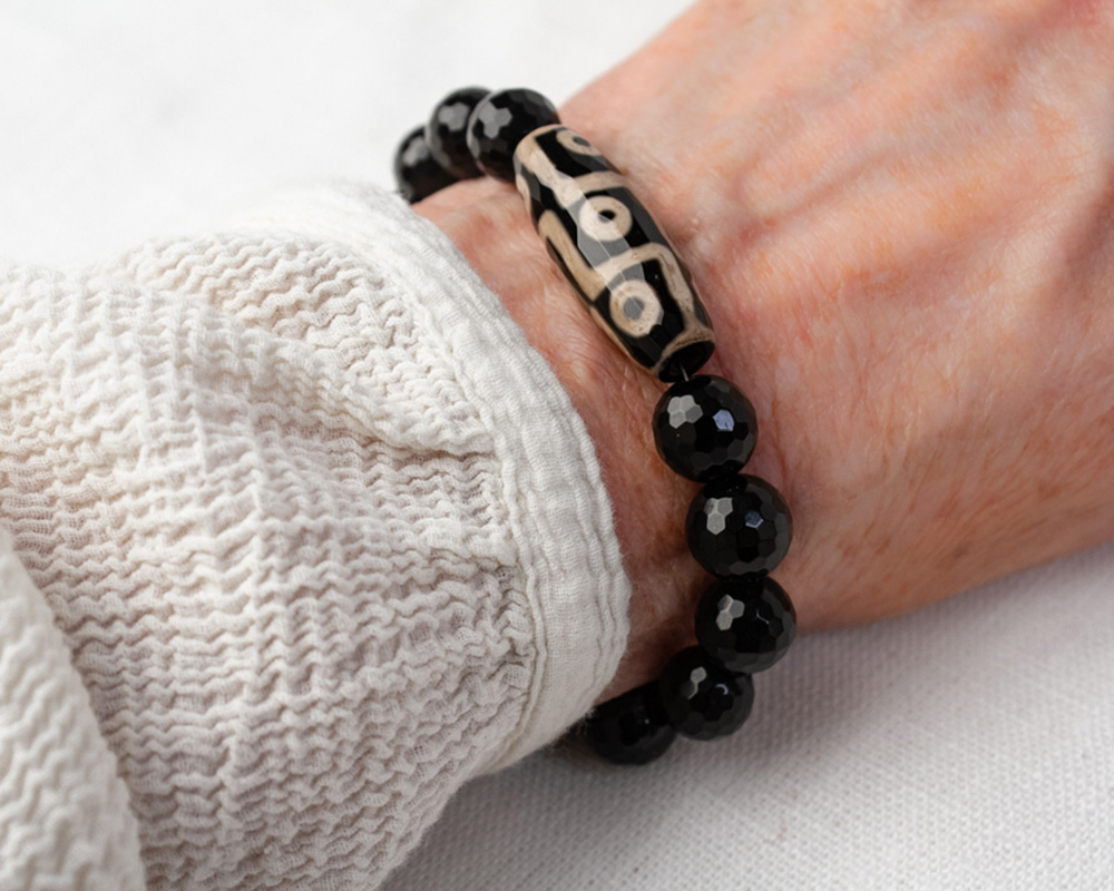 Hand made African bead with 10mm Onyx round faceted beads and a Sterling Silver Clasp. 7″