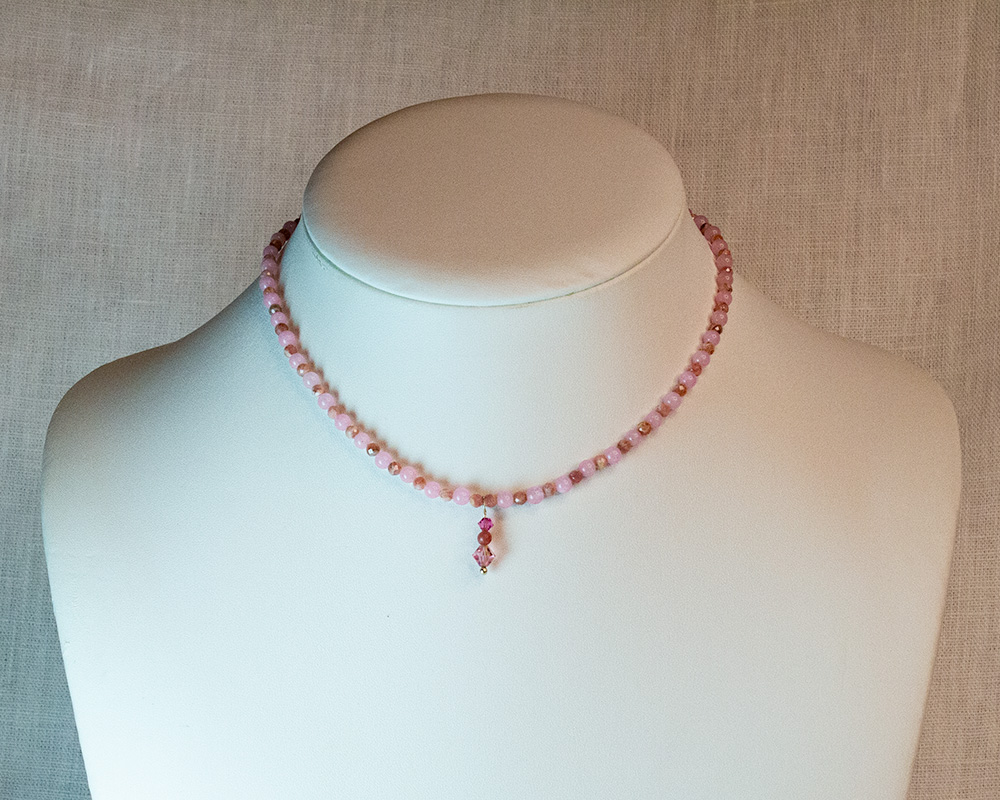 16″ Pink Quartz and Pink Agate bead necklace with a Swarovski Crystal pendant drop and a Sterling Silver clasp. For the matching earrings go here.
