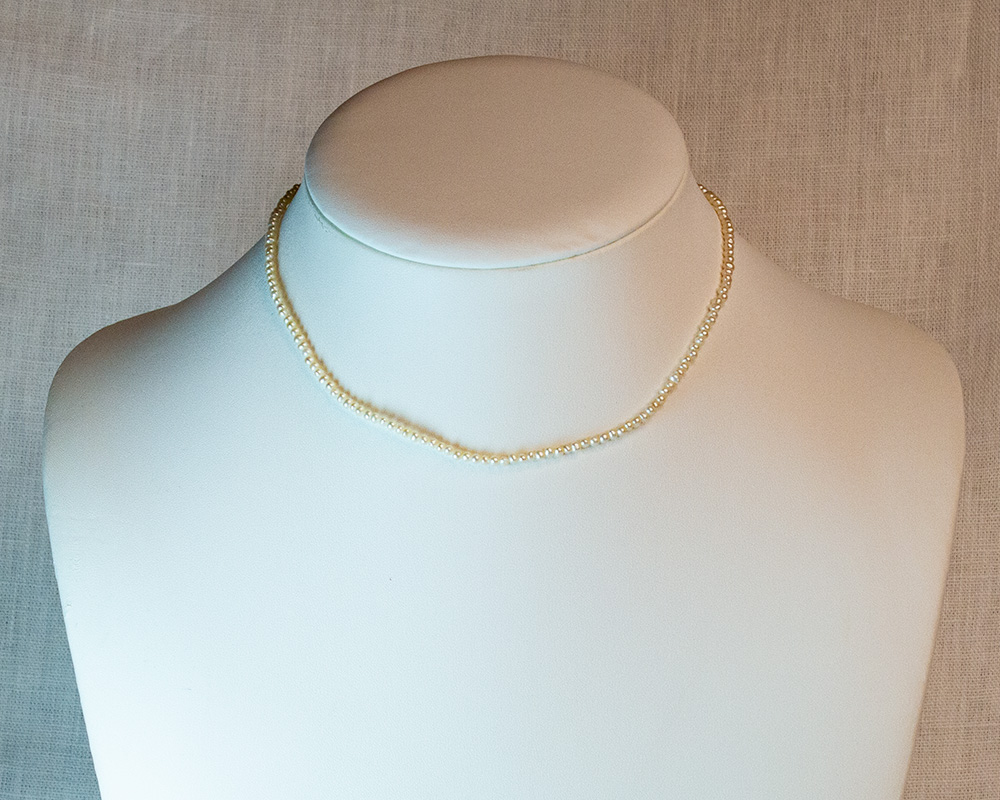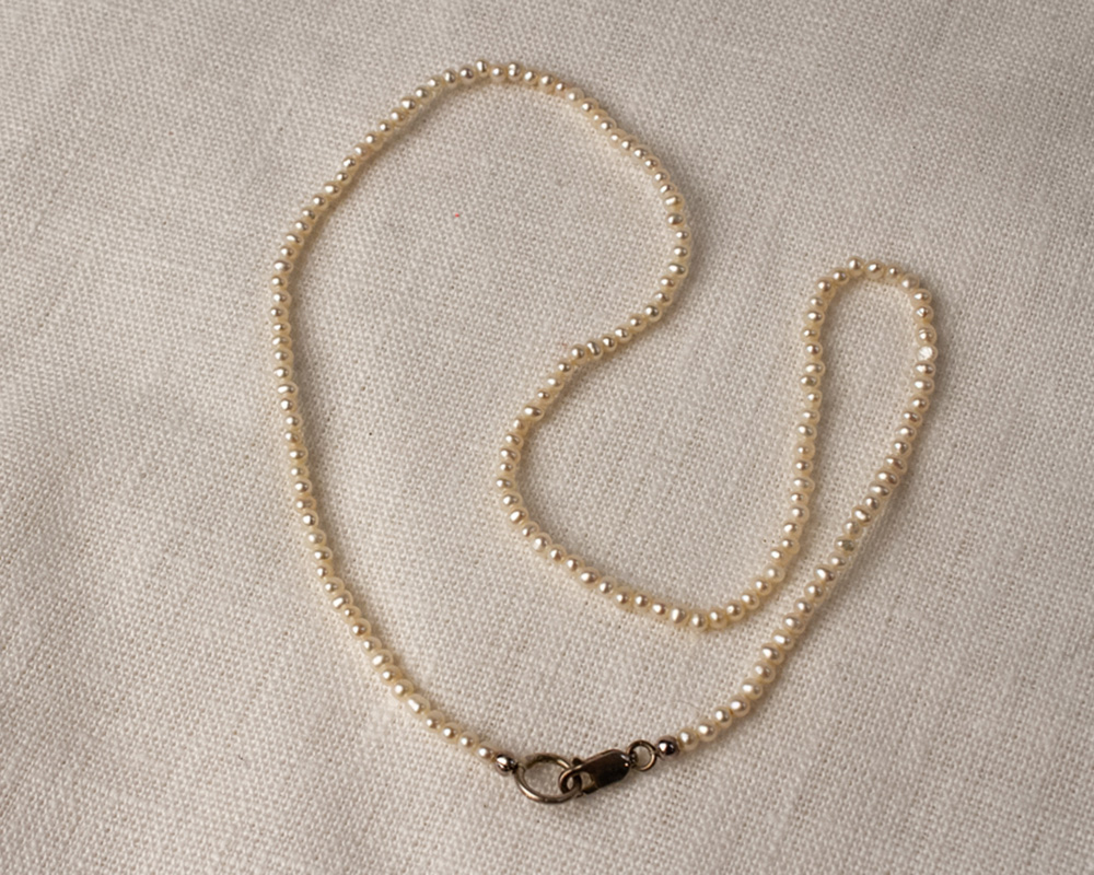 Beautiful minimalist 16″ simple strand of 3mm white Freshwater Pearls. The clasp is Sterling Silver.